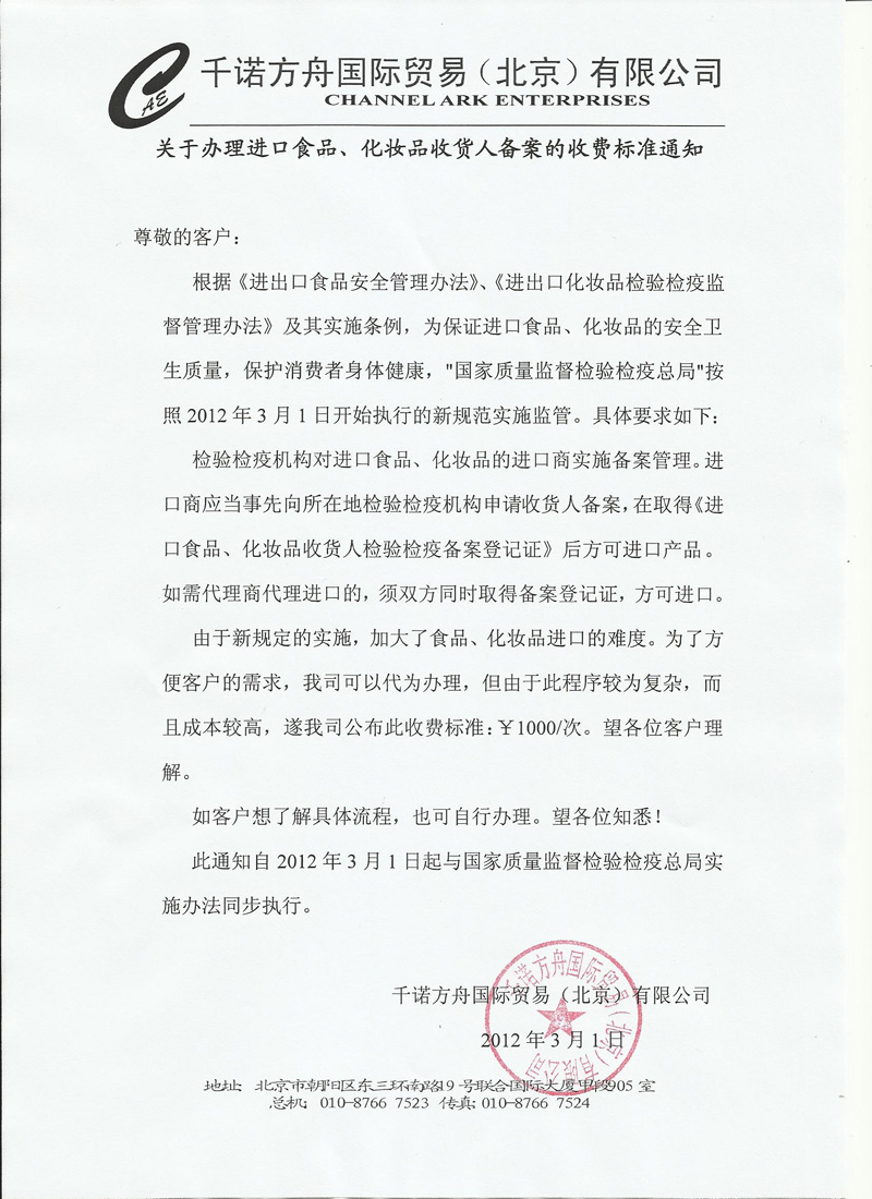 辦理進(jìn)口食品、化妝品收貨人備案收費(fèi)標(biāo)準(zhǔn)通知